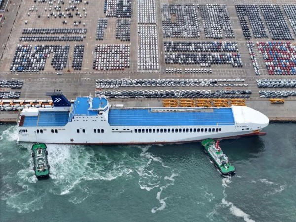 6月29日,汽車運輸船停靠山東港口煙臺港,準備裝運出口汽車(無人機照片)。新華社發(唐克 攝)