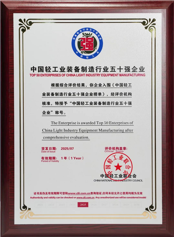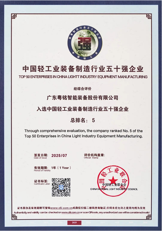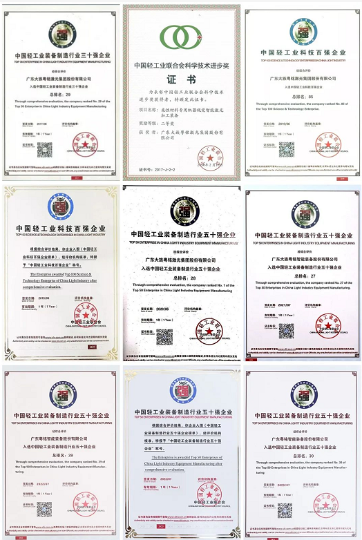 憑借雄厚的企業實力與持續增強的行業影響力,大族粵銘及旗下子公司連續多年榮膺“中國輕工業裝備制造行業五十強企業”、“中國輕工業科技百強企業”等權威榮譽稱號。