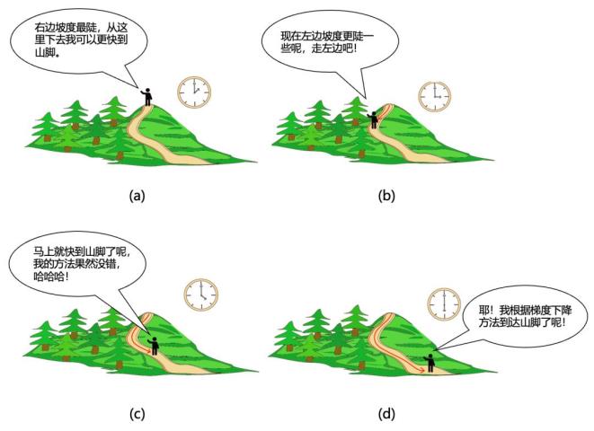 這種方案就像我們在山頂尋找通往山谷的最短路徑。當你站在山頂上時,這時還不知道最佳的路徑,只有一個粗略的方向。如果是你,你會怎么做呢?