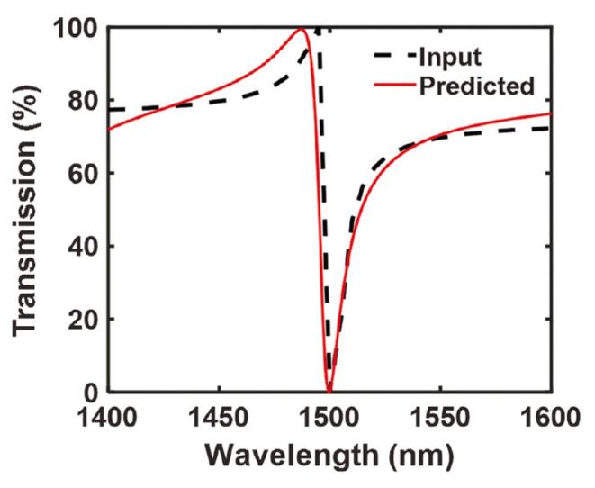 圖 7:輸入透射光譜(黑色虛線)和神經網絡模型預測結構的透射光譜(紅色實線)比較[5]