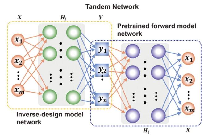 圖 6:由一個逆向設計模型網絡和一個預訓練的正向模型網絡連接而成的TN模型架構[5],其中,X表示輸入和輸出,即透射光譜數據,而Y表示中間層的輸出,對應的是結構參數。