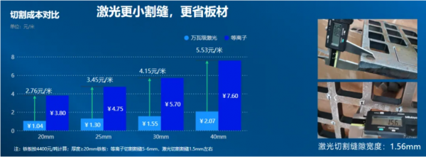 2025年上半年,銳科激光在鋼構行業銷售額同比增幅達63%。數據的背后,是萬瓦級激光器在鋼構加工中“精度+效率”雙重優勢的集中爆發。具體以銳科20kW及以上激光器對比市面上300A等離子而言,效率、成本優勢尤為明顯: