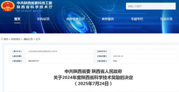 注:《中共陜西省委 陜西省人民政府關(guān)于2024年度陜西省科學(xué)技術(shù)獎(jiǎng)勵(lì)的決定》原文詳見:https://kjt.shaanxi.gov.cn/kjdt/tzgg/202508/t20250813_3554617.html