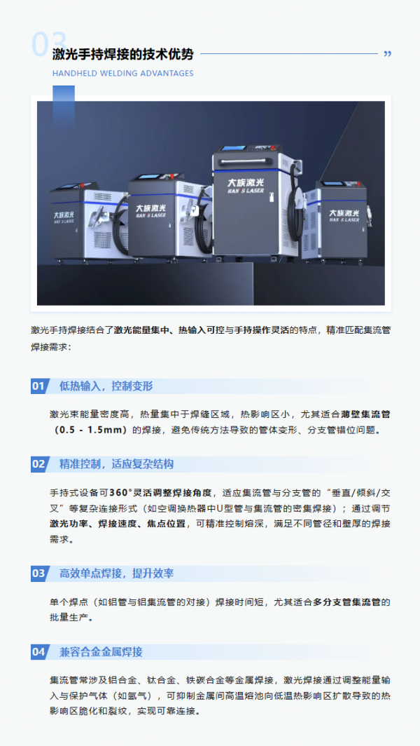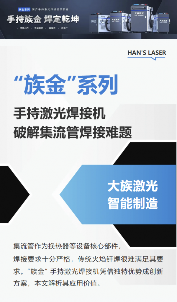 “族金”系列手持激光焊接機HAN'S LASER大族激光智能制造集流管作為換熱器等設(shè)備核心部件,焊接要求十分嚴格,傳統(tǒng)火焰釬焊很難滿足其要求。“族金” 手持激光焊接...