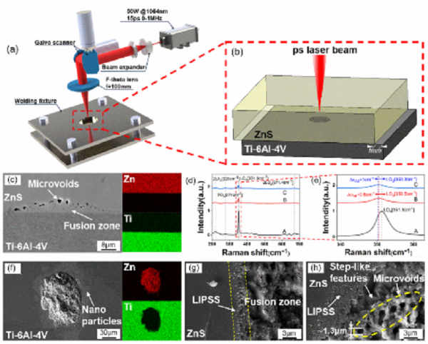 圖1.(a)ZnS與Ti-6AI-4V皮秒激光焊接示意圖;(b)試片疊放方式示意圖;(c)單脈沖加工區(qū)域的截面形貌與主要元素分布;(d,e)截面不同測(cè)量位置處的拉曼光譜;(d)Ti-6AI-4V側(cè)的斷口形貌與主要元素分布;(g,h)ZnS側(cè)的斷口形貌。