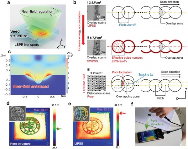 e)激光誘導周期表面結構(LIPSS)構成的校徽圖案(可見光與紅外圖像);