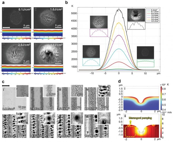 d)微/納米孔形成過程中的溫度場與流場模擬。