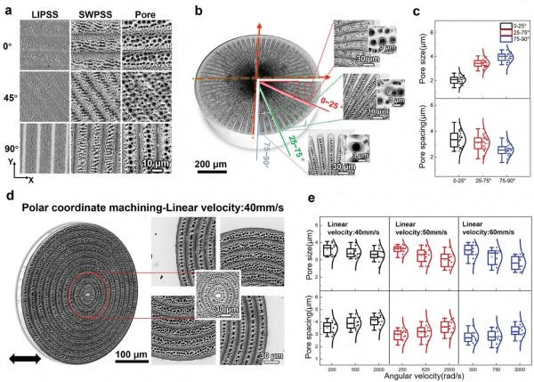 b)激光偏振角(0°-360°)對自排列微/納米孔的影響;