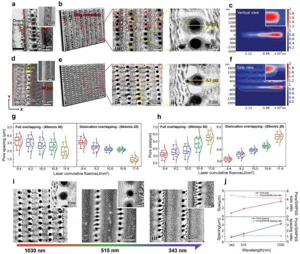 i)343 nm(光斑8 μm, Δy=5 μm)/515 nm(光斑16 μm, Δy=9 μm)/1030 nm(光斑25 μm, Δy=10 μm)激光波長下的微/納米孔形貌