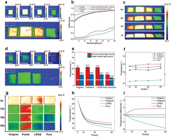 f)表面微/納結構金屬玻璃的紅外熱成像測量。