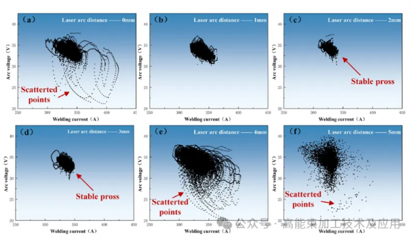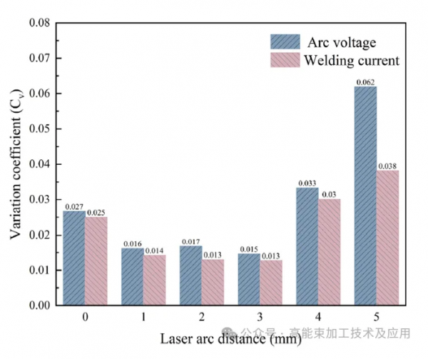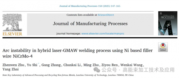 來自蘭州理工大學(xué)的研究人員在國際期刊“Journal of Manufacturing Processes”發(fā)表了論文“Arc instability in hybrid laser-GMAW welding process using Ni based filler wire NiCrMo-4”。 01 論文導(dǎo)讀 本文通過引入電流與電壓的變異系數(shù)(Cv),定量評估了激光-GMAW復(fù)合焊接(LAHW)過程中電弧穩(wěn)定性,突破了傳統(tǒng)僅依賴熔滴過渡頻率和臨界尺寸的評價局限。研究構(gòu)建了激光誘導(dǎo)金屬蒸氣反作用力的理論模型,并采用紅外測溫實驗對熔池溫度參數(shù)進(jìn)行校正,實現(xiàn)了對該作用力的量化計算與作用范圍界定。結(jié)合高速攝影與示波器進(jìn)行過程分析,明確了激光-電弧軸向距離(DLA)對熔滴行為與電弧穩(wěn)定性的調(diào)控機(jī)制,為鎳基合金的高質(zhì)量焊接提供了新的過程監(jiān)測方法與工藝優(yōu)化理論依據(jù)。 02 全文概述 本研究通過實驗與理論分析,探討了LAHW中DLA對ER-NiCrMo-4鎳基合金焊接穩(wěn)定性的影響。結(jié)果表明,DLA在2~3 mm時電弧最穩(wěn)定,電流電壓波動最小,熔滴過渡模式由不規(guī)則旋轉(zhuǎn)噴射轉(zhuǎn)變?yōu)榉€(wěn)定投射過渡。高速攝像分析顯示,DLA過小或過大會導(dǎo)致熔滴過渡不穩(wěn)定、飛濺增多。該研究為鎳基合金LAHW工藝的優(yōu)化提供了重要依據(jù),推動了其在高端裝備制造中的應(yīng)用。 03 圖文解析 如圖1所示,隨著DLA增大,電流與電壓的變異系數(shù)(Cv)先降后升,并在DLA=3 mm時同時達(dá)到最小值,表明該條件下電弧燃燒最穩(wěn)定、工藝波動最小,顯示出激光與電弧能量在特定間距下熱源耦合效果最佳。 圖1. 焊接電流和電壓的變異系數(shù)Cv。 如圖2所示,當(dāng)DLA為0 mm和1 mm時,電信號循環(huán)圖波動顯著,存在離散點;DLA為2-3mm時,曲線集中且穩(wěn)定;而DLA增至4-5mm后,散點再度增多,過程穩(wěn)定性下降,表明該距離下激光-電弧耦合作用減弱。 圖2. 不同DLA的環(huán)形圖對比。 如圖3所示,金屬蒸氣反作用力(FD)隨DLA增大而減小,當(dāng)DLA為0 mm時達(dá)到最大值0.04 N,顯著影響電弧與熔滴穩(wěn)定性;當(dāng)DLA增至2 mm時,F(xiàn)D接近零,其對熔滴過渡的干擾基本消失。該結(jié)果從力學(xué)角度解釋了DLA過小時工藝不穩(wěn)定的原因。 圖3. DLA與金屬蒸汽反沖力之間的關(guān)系。 不同光絲間距(DLA)顯著影響熔滴過渡行為:DLA為0-1mm時,熔滴受金屬蒸氣反作用力干擾,熔滴過渡過程不穩(wěn)定;DLA為2-3mm時,實現(xiàn)穩(wěn)定射流過渡,飛濺極少;DLA增至4-5mm后,耦合減弱,過渡再次失穩(wěn),出現(xiàn)明顯飛濺缺陷。 圖4. 不同DLA下熔滴過渡行為的示意圖。 圖5可以得出,飛濺數(shù)量隨DLA增大呈先降后升趨勢:DLA為0-3 mm時,飛濺顯著減少,尤其在2-3 mm區(qū)間達(dá)到最低,表明過程穩(wěn)定性最優(yōu);當(dāng)DLA增至4-5 mm,飛濺數(shù)量再度上升。 圖5. 不同DLA下熔滴的飛濺數(shù)量統(tǒng)計。 04 結(jié)論 本文揭示了DLA對鎳基合金激光-GMAW復(fù)合焊接穩(wěn)定性的影響機(jī)制,通過多模態(tài)分析方法為鎳基合金材料的高質(zhì)量焊接提供了重要理論依據(jù)與工藝指導(dǎo),得到了下列結(jié)論: (1)通過電信號變異系數(shù)Cv和高速攝影發(fā)現(xiàn),DLA在2–3 mm范圍內(nèi)電弧穩(wěn)定性最佳,電流電壓波動最小,熔滴實現(xiàn)穩(wěn)定投射過渡,飛濺極少。而DLA小于1 mm以及大于4 mm時,均出現(xiàn)顯著的不穩(wěn)定的熔滴過渡過程和飛濺缺陷,表明激光-電弧能量耦合對過程穩(wěn)定性具有決定性作用。 (2)建立了激光誘導(dǎo)金屬蒸氣反作用力的理論模型,結(jié)合紅外測溫實驗進(jìn)行參數(shù)校正,量化了該力隨DLA增大而衰減的規(guī)律。當(dāng)DLA超過2 mm時,反作用力接近零,其對熔滴過渡的干擾基本消失,從力學(xué)角度完整解釋了不同DLA下的工藝穩(wěn)定性差異。