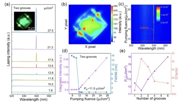 在圖中清晰地揭示了具有兩個溝槽的微片上發光強度的空間分布,這是通過系統的儀器測試獲得的激光映射。不同泵浦能量強度下的激光光譜的二維偽彩色圖如圖所示。當泵浦強度超過11.5微焦耳/平方厘米時,從寬帶自發發射到受激發射的特征轉變清晰可見,其特征是FWHM急劇變窄和強度突然激增。這一結果清楚地揭示了樣品的光學增益特性,其中發生了光學放大。此外,圖中展示了具有不同溝槽數量的樣品的激發強度依賴的PL光譜響應和激光閾值,這表明了從自發發射到激光的轉變。還發現,在相同的激發功率下,鈣鈦礦微片內的溝槽越多,其自發發射的強度越低。這一現象可以解釋如下:1)隨著溝槽數量的增加,樣品的Sa逐漸增加,增強了溝槽界面處的光散射并加劇了非輻射復合;2)溝槽結構引入了更多的表面缺陷,增強了表面捕獲激子的非輻射復合,并抑制了自由激子的輻射復合;3)在擴散到表面的過程中,更多的自由激子被溝槽處的缺陷捕獲,轉化為表面捕獲激子,減少了自由激子的數量。隨著溝槽數量的增加,圖中清楚地顯示出激光閾值的逐步增加,顯示出溝槽數量與激發需求之間的直接相關性。這一觀察到的趨勢可以歸因于與具有兩個溝槽的情況相比,隨著溝槽數量的增加,微腔模式的出耦合效率更強,導致更大的輻射損耗和更高的激光閾值。因此,最佳的溝槽數量(鈣鈦礦微片中嵌入兩個溝槽)增強了光學反饋,而過多的溝槽引入了多個非輻射散射中心,促進了寄生光子泄漏,從而降低了激光性能,特別是對于單模純度。