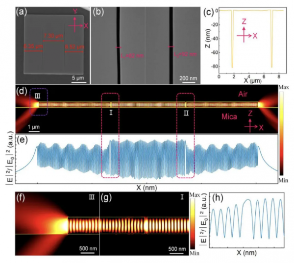 進一步研究了溝槽結構對CPB微片激光性能的影響。如圖所示,兩個溝槽的微片顯示出近乎對稱的溝槽位置和高度均勻的寬度分布。使用原子力顯微鏡(AFM)表征確定的溝槽深度和微片厚度。這些破裂的微腔可能影響激光模式的形成和選擇。圖揭示了在微片的溝槽位置處由于耦合腔相互作用而產生的顯著電場變化。值得注意的是,耦合腔對兩個腔體之間的間隙非常敏感,其中間隙間距影響的散射和衍射效應在確定耦合強度方面起著重要作用。發現寬度大約在80到90納米之間的形成的溝槽能夠實現有效的腔體間耦合。因此,觀察到的單模激光歸因于由多個解理腔產生的耦合效應。FDTD模擬結果表明,微腔在溝槽區域顯示出相對較大的自由光譜范圍(FSR)。由于這一特性,在這些具有工程化溝槽缺陷的微片中觀察到了單模激光發射。微片端面和溝槽處的放大電場分布分別如圖所示。此外,與完整結構相比,具有溝槽的微片的激光模式數量顯著減少,盡管沒有實現單模運行。這是因為耦合腔中的空氣間隙寬度在確定激光行為方面起著關鍵作用。具有一個嵌入溝槽(寬度約為165納米)的鈣鈦礦微片的電場分布如圖所示。這個較大的空氣間隙增強了向外的光散射,同時減少了終端微腔之間的光學傳輸,最終降低了它們的耦合效率。根據上述討論,要在鈣鈦礦微片中實現高性能單模激光,需要三個基本條件:i)最佳的溝槽數量;ii)足夠窄的空氣間隙以確保耦合效率;iii)適當的溝槽位置分布。