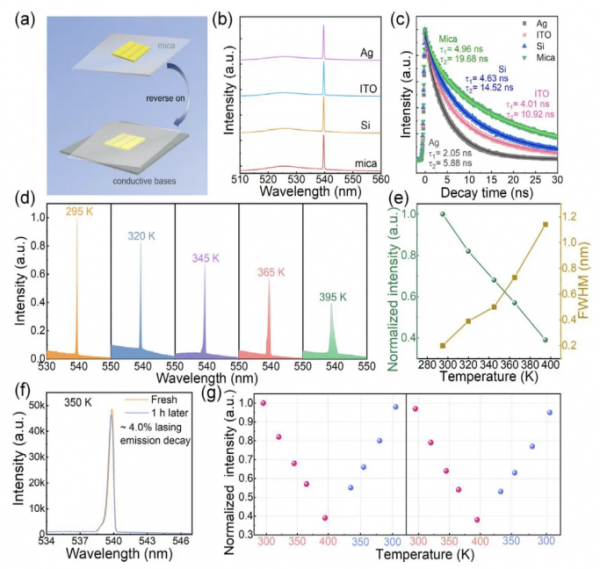 為了展示它們與光電子芯片集成的潛力,將嵌入溝槽的CPB微片激光器成功地集成在各種導電基底上,包括硅、氧化銦錫(ITO)和銀。值得注意的是,單晶鈣鈦礦微片是在透明絕緣的云母基底上外延生長的,通過簡單的基底翻轉直接集成到目標基底上,無需后處理。額外的實驗細節如圖S23(支持信息)所示。在所有四種基底上,使用相同的微片成功實現了室溫單模激光發射,相關的激光光譜如圖所示。通過時間分辨PL定量映射了基底依賴的載流子動力學。壽命從云母(τ1=4.96納秒,τ2=19.68納秒)逐漸降低到硅(τ1=4.63納秒,τ2=14.52納秒)、ITO(τ1=4.01納秒,τ2=10.92納秒)和金(τ1=2.05納秒,τ2=5.88納秒)。這源于導電基底上增強的非輻射猝滅通道。首先,界面復合的加速通過促進表面非輻射路徑縮短了τ1。同時,擴散介導的基底界面處的載流子猝滅加速了體載流子的耗盡,從而減少了τ2。然而,四個CPB微激光器件中的激光峰的位置和相對強度幾乎沒有變化,表明基底對激光行為的影響可以忽略不計。這些具有明確定義的溝槽的鈣鈦礦微片在不同基底上顯示出穩定且受控的激光行為,這表明它們在相關芯片集成方面具有相當的潛力。