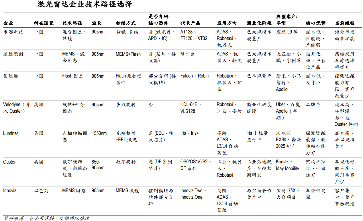 競爭格局呈現中國廠商主導態勢,禾賽科技與速騰聚創各占全球車載市場29%份額,圖達通占21%,三者合計達79%。技術路線上,機械式雷達因成本高(數萬美元)逐步被替代,半固態成為主流,其中轉鏡式探測距離突破200米,MEMS振鏡式更易集成。全固態技術中,OPA和FLASH路線被視為未來方向,但尚未大規模量產。
