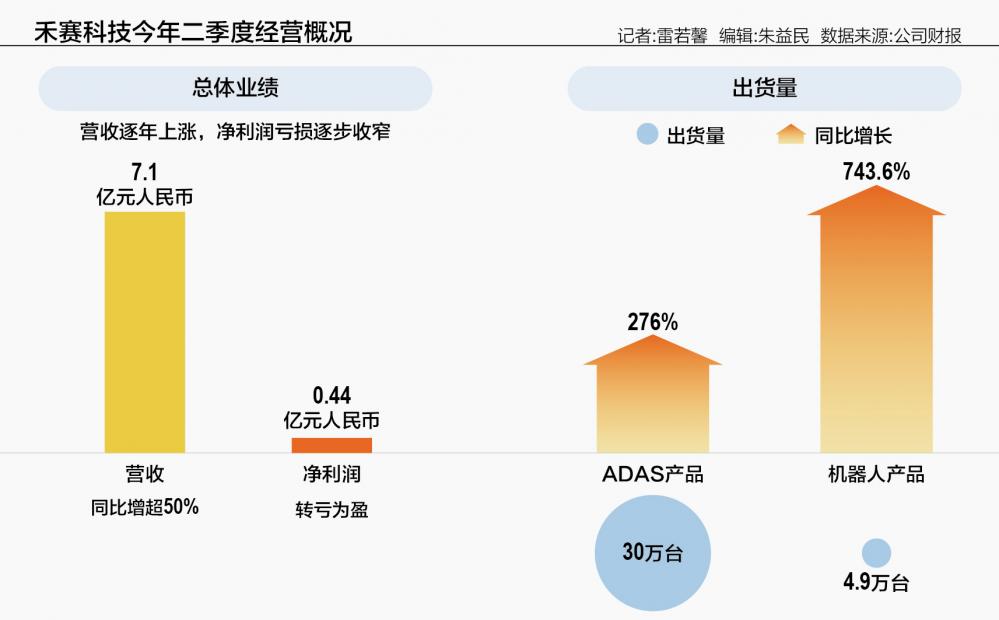 今年二季度,禾賽實(shí)現(xiàn)營收7.1億元人民幣,同比增超50%,凈利潤(rùn)0.44億元人民幣,轉(zhuǎn)虧為盈。
