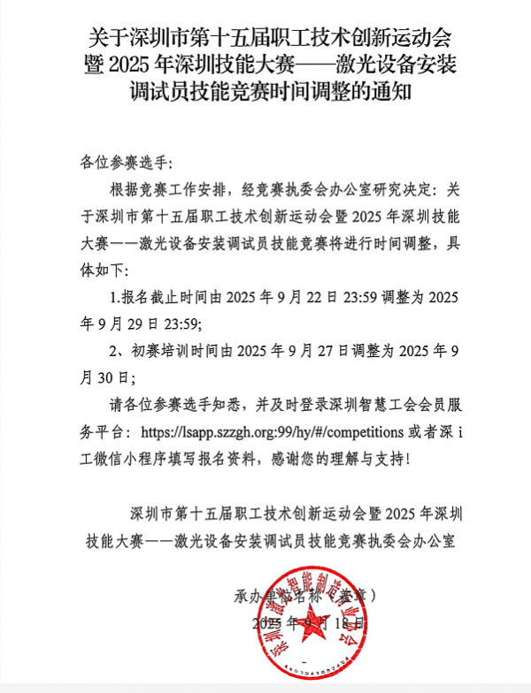 根據競賽工作安排,經激光設備安裝調試員技能競賽執委會辦公室研究決定,激光設備安裝調試員技能競賽時間調整,具體如下: