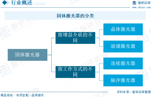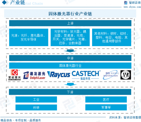 固體激光器產業鏈上游為光源、光學材料及其他原材料,其中,光源包括光纖、激光晶體、發光半導體;光學材料包括放大器、耦合器、泵浦源、光纜、開關、光學鏡片、光柵、巴條、合數束器;其他材料包括鋼材、鋁材、塑料、電容、電阻、其他通用零部件。產業鏈中游為固體激光器的生產制造。產業鏈下游為應用領域,固體激光器廣泛應用于工業、醫療、科研、軍事等領域。在工業上,固體激光器常用于切割、焊接、打標等;在醫療上,固體激光器常用于激光手術、激光治療等;在科研上,固體激光器常用于光譜分析、激光雷達等;在軍事上,固體激光器常用于雷達、導航系統、激光瞄準器等。