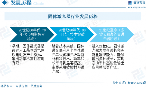 早期,固體激光器是通過人工晶體或氣體放電激發產生激光,輸出功率不高且應用有限。隨著技術突破,固體激光器利用半導體激光二極管和光纖等新材料和技術,功率和效率得到顯著提高,主要采用釹摻材料激光器。進入21世紀,固體激光器發展多波長和高能量輸出能力,能夠輸出多種波長、實現高功率和高能量輸出,應用領域更廣泛。當前,固體激光器行業正向智能化和集成化發展,追求穩定性、可靠性和自動化控制能力,未來還將持續創新發展,推動激光技術在各行各業的應用范圍不斷擴大。