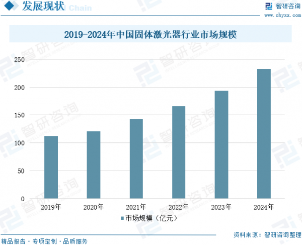 固體激光器是激光器的一種重要類型,它利用固體材料作為激光工作物質來產生激光。固體激光器具有體積小、使用方便、輸出功率大等特點,被廣泛應用于工業、醫療、科學研究等領域。特別是在工業領域,固體激光器已成為一種重要的加工工具,可用于切割、焊接、打標、微加工等多種應用。固體激光器作為國家重點支持的高新技術產業之一,其發展受到國家政策的大力支持。近年來,中國政府出臺了一系列激光產業發展的政策,包括《關于加快應急機器人發展的指導意見》《關于推動未來產業創新發展的實施意見》等,政策的出臺為固體激光器行業的發展提供了有力的保障和支持。與此同時,得益于下游應用的不斷拓展,尤其是工業制造、醫療健康和科學研究等領域的強勁需求,中國固體激光器市場規模整體呈現逐年增長的態勢。數據顯示,2024年中國固體激光器市場規模約為232.8億元。未來,隨著材料科學、制造工藝和激光技術的不斷進步,固體激光器的性能將得到進一步提升,包括降低噪聲、提高輸出功率、優化光束質量等,并推動行業市場規模進一步擴大。