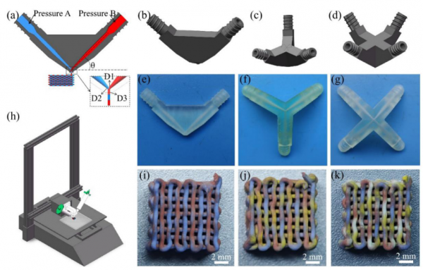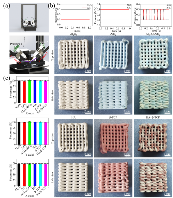 研究團隊自主設計并制備了新型多流道匯聚噴頭,將其集成于3D打印設備后,成功實現了2種、3種及4種陶瓷漿料復合支架的精準3D打印成型。該結果充分驗證了所提集成方案的可行性——通過創新噴嘴結構、定制化直接墨水書寫系統與優化工藝參數的協同配合,有效突破了多組分陶瓷復雜結構的增材制造瓶頸。