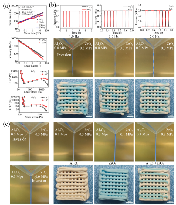 此外,研究團隊系統探究了多種陶瓷漿料的流變學特性,為 3D 打印工藝參數的科學規劃提供了關鍵理論依據。在此基礎上,進一步針對脈沖模式與相對壓力控制作用下的漿料流變行為展開深入分析。結果表明,通過優化脈沖切換頻率并精準實施相對壓力調控,可有效抑制多材料3D 打印過程中的漿料竄流現象,為該核心難題的解決提供了初步技術方案。