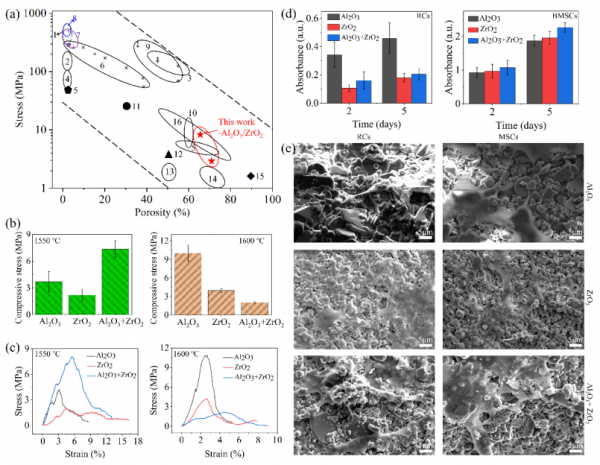 性能測試結果顯示,所制備的多陶瓷復合支架在機械性能與生物相容性方面,均表現出優于單組分陶瓷支架的特性。這一結果初步證實,3D 打印多陶瓷支架在生物醫學領域(尤其是骨科植入物、齒科修復體等精準醫療場景)具備良好的應用潛力。