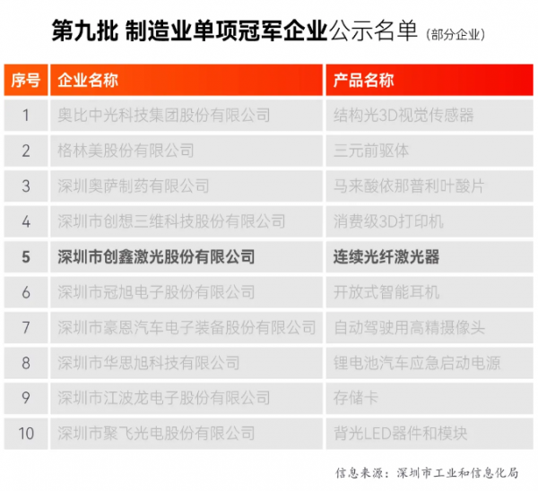 近日,工業(yè)和信息化部正式公布了第九批制造業(yè)單項冠軍企業(yè)名單,創(chuàng)鑫激光憑借在連續(xù)光纖激光器領域的卓越表現(xiàn)與其在全球市場領先地位成功入選。這也是國產(chǎn)連續(xù)光纖激光器首次入選國家級“制造業(yè)單項冠軍企業(yè)”,標志著創(chuàng)鑫激光尤其是連續(xù)激光器這塊的技術實力、市場地位和品牌價值獲得了國家層面的最高肯定!