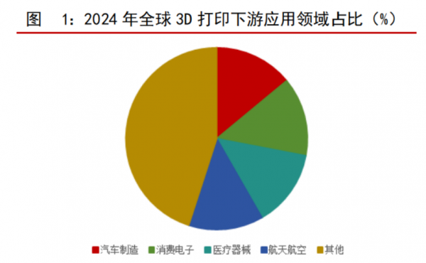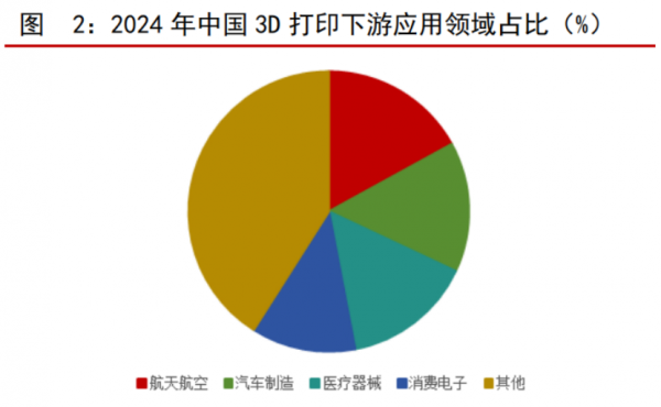 3D 打印產業鏈上游主要包括打印材料、核心零部件以及輔助運行系統,中游為打印材料制造商、打印設備廠商、打印服務提供商。下游涵蓋領域不斷擴展,2024 年全球 3D打印行業下游應用領域前三分別為汽車制造、消費電子、醫療器械,中國下游應用領域以工業級為主,前三分別為航天航空、汽車制造、醫療器械。