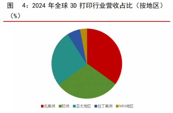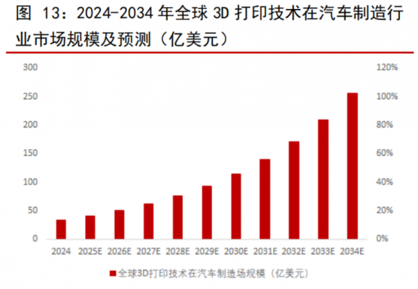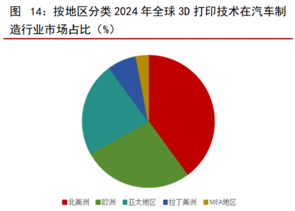 隨著汽車制造領域的工裝夾具、模具、新能源汽車輕量化等零部件的市場需求增加,將進一步助推3D 打印技術在汽車制造領域滲透率提升。根據 Precedence Research, 2024 年全球 3D 打印技術在汽車制造行業市場規模為 33.60 億美元,預計 2025 年市場規模將超過 40.00 億美元。在汽車制造領域,3D 打印技術滲透率最高的仍為北美地區,主要系 3D 打印技術能有效起到降本增效作用,福特、通用、特斯拉等美國汽車制造商均重度使用 3D 打印技術。此外,預計未來汽車制造行業的 3D 打印技術在亞太地區將快速發展。
