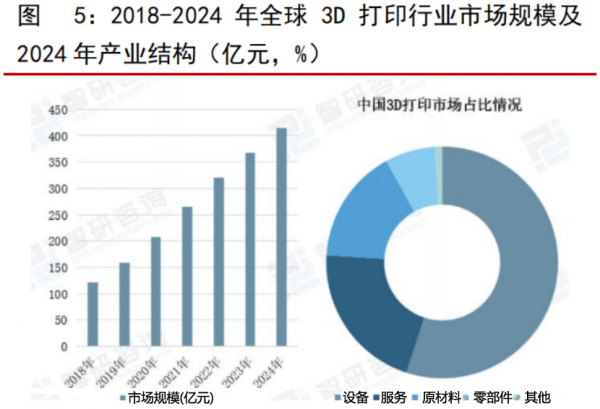 根據Fortune Business Insight、Precedence Research,2024 年全球 3D 打印行業市場規模約為 193.30 億美元,預計將從 2025 年的 292.90 億美元增長至 2034 年的1345.80 億美元,年復合增長率為 18.46%。按地區來看,北美市場占據行業主導地位, 2024 年營收占比約為 36.00%,主要系北美地區為 3D 打印技術創新地之一,3D 打印滲透率較高。根據智研咨詢,隨著 3D 打印產品逐步規模化應用和需求釋放拉動,中國 3D 打印行業市場規模整體呈增長態勢。2024 年中國 3D 打印行業市場規模約為 415.00 億元。從產業結構來看,打印設備和打印服務的營收占比較高,分別占比為55.00%,21.00%。