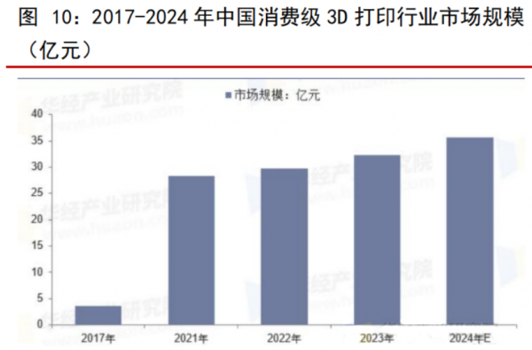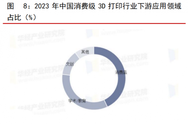 細分領域來看,國家政策支持及技術提升助推中國工業級3D 打印行業加快發展,行業市場規模上升空間巨大。根據共研產業咨詢,預計 2027 年中國工業級3D 打印行業市場規模將突破 155.00 億元,近五年呈逐漸增長趨勢。隨著技術和材料不斷突破迭代, 3D 打印下游應用場景正由工業級滲透至消費級,逐步形成 B、C 端同步實現規模化、精細化、創新化的發展特點。消費級 3D 打印設備主要用于制作原型、模型和自定義物品,其操作簡便、成本相對較低,一般采用 FDM、SLA 等技術。目前,消費級 3D 打印主要應用領域為消費品、學術/教育、文創等領域,占比分別為 43.00%、34.00%、10.00%。隨著技術持續進步、成本下降,疊加個性化和文創產品需求增加等因素驅動,下游滲透率將加速提升,消費級 3D 打印設備銷量將呈增長趨勢,市場規模上限提升。