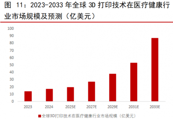 3D 打印技術可快速實現不同個體的醫學模型、輔助器械、植入體等產品制造,有助于實現臨床上的個體化、精準化治療。從最初的醫療模型快速制造逐漸發展至 3D 打印技術直接制造助聽器外殼、植入物、復雜手術器械、康復輔具和增材制造藥品,正逐步拓展更多細分領域應用場景,為醫療行業提供新的更精準、更有效、更安全的手術技術治療方案。3D 打印技術在醫療健康領域的優勢包括(1)允許更大的設計自由度和復雜性,能夠創建復雜的幾何圖形和內部結構;(2)能縮短醫療器械、植入物所需交貨時間,簡化制造過程并減少裝配需求,容錯率提升并改善質量控制;(3)通過創建患者器官或四肢的解剖模型進行手術前計劃和手術練習從而改善手術效果;(4)通過定制的醫療設備和植入物降低感染和并發癥的風險,并改善患者的治療結果與后續護理。