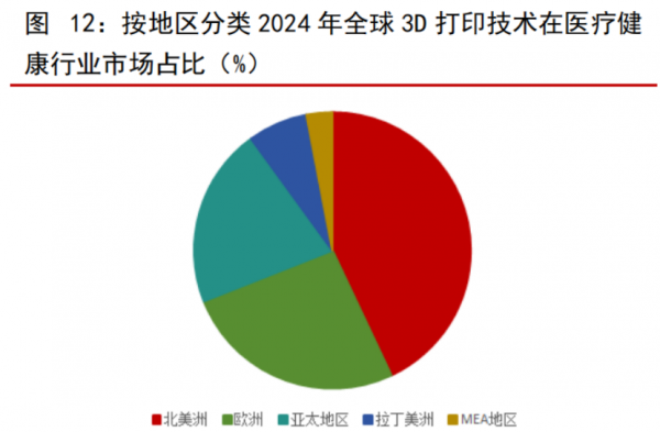 根據Aranca,2024 年全球 3D 打印技術在醫療健康行業市場規模為 17.00 億美元,同比增長 20.57%,預計 2025 年市場規模將接近 20.00 億美元。2024 年北美為 3D 打印技術在醫療領域滲透率最高地區,其次是歐洲和亞太地區。中國作為亞太地區最大的醫療消費國家,醫療健康領域 3D 打印市場發展潛力大。