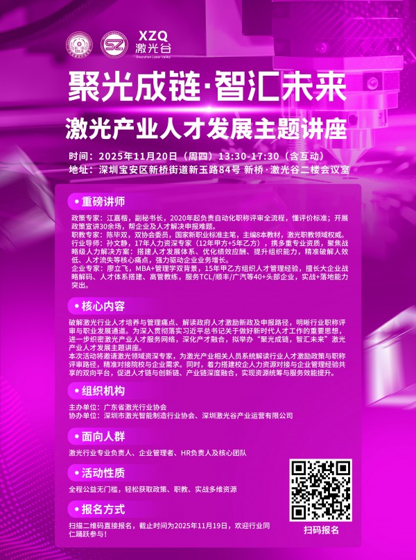 為深入貫徹落實國家人才戰略,促進激光產業人才鏈、創新鏈與產業鏈的深度融合,在深圳市精密儀器與智造激光行業聯合黨支部的引領下,2025年11月20日,廣東省激光行業協會攜手深圳市激光智能制造行業協會與深圳激光谷產業運營有限公司,共同舉辦“聚光成鏈,智匯未來”激光產業人才發展主題講座。