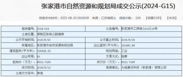 作為激光行業(yè)龍頭企業(yè),大族激光的每一步布局都牽動行業(yè)神經(jīng)。2025年8月,大族激光科技(張家港)有限公司以6522.7195萬元競得張家港市保稅區(qū)141490.66平方米工業(yè)用地,為其華東區(qū)域產(chǎn)能擴(kuò)充落下關(guān)鍵一子。該地塊采用江蘇首創(chuàng)的“標(biāo)準(zhǔn)地+雙信地+定制地”出讓模式,政府提供“三凈地”保障,實(shí)現(xiàn)“成交即發(fā)證、交地即開工”,企業(yè)則承諾固定資產(chǎn)投資強(qiáng)度不低于802萬元/畝,彰顯政企協(xié)同發(fā)展的高效性。