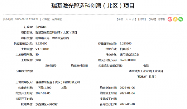 武漢作為“中國光谷”所在地,始終是激光產(chǎn)業(yè)的戰(zhàn)略高地。2025年9月,瑞基激光智造(武漢)科創(chuàng)有限公司以8620萬元拿下東西湖區(qū)5.2256公頃土地,啟動總投資17億元的科創(chuàng)灣(北區(qū))項(xiàng)目,計(jì)劃2027年開工、2029年竣工,打造激光產(chǎn)業(yè)創(chuàng)新生態(tài)綜合體。