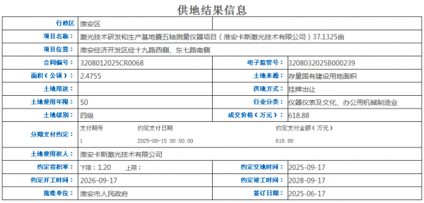 在激光產(chǎn)業(yè)高端化進(jìn)程中,核心部件與精密測量技術(shù)的突破成為關(guān)鍵。2025年6月,淮安卡斯激光技術(shù)有限公司以618.88萬元競得淮安經(jīng)濟(jì)開發(fā)區(qū)37.13畝土地,啟動激光技術(shù)研發(fā)和生產(chǎn)基地暨五軸測量儀器項(xiàng)目,將于2026年開工、2028年竣工,專注激光核心技術(shù)攻堅(jiān)。
