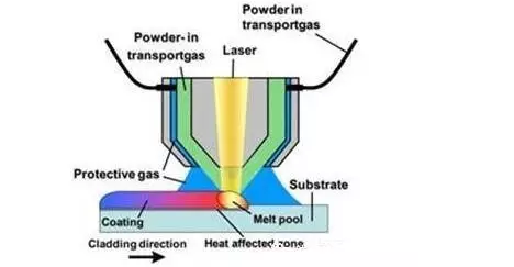 同步式激光熔覆則是將熔覆材料直接送入激光束中,使供料和熔覆同時完成。熔覆材料主要也是以粉末的形式送入,有的也采用線材或板材進(jìn)行同步送料。同步式激光熔覆的主要工藝流程為:基體材料熔覆表面預(yù)處理-送料激光熔化-后熱處理。
