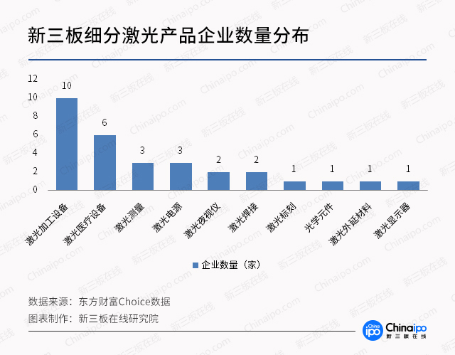 新三板方面,激光相關企業共有30家,包括的激光產品種類比較豐富。如工業激光加工設備、醫療設備、激光測量、激光電源、夜視儀、焊接、顯示器等等。其中主營為“激光加工設備”和“激光醫療設備”的公司最多,分別為10家和6家,占比超過一半。