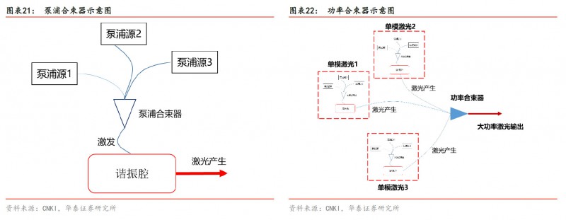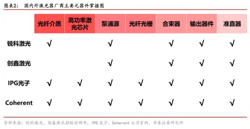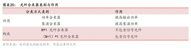 光纖合束器主要作用是進行光束合成增大輸出功率。目前國內主要激光器制造商銳科與創鑫都已掌握合束器制造核心技術并實現規模化生產,但是國內廠商在輸出功率上與國外龍頭公司Coherent、IPG等仍有差距。