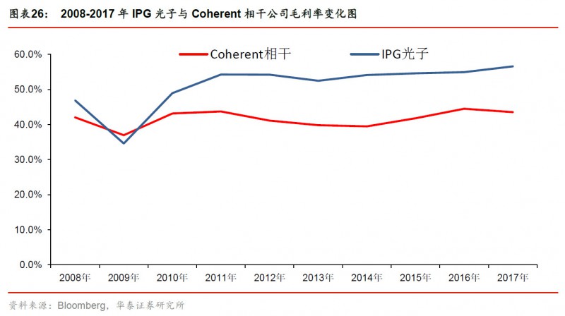 國內廠商已掌握大部分器件制造技術,但光纖介質、高功率激光芯片和光纖光柵核心元器件仍依賴進口,除此之外的核心元器件技術已被掌握,而國外激光器龍頭IPG光子、Coherent依靠全產業鏈整合實現產品低成本和性能高穩定性。目前國內廠商毛利率水平較高,核心元器件若進一步國產化有望為國內廠商業績提供充足支撐。