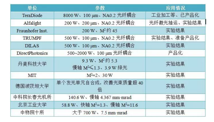 可以看出,半導體激光波分復用合束技術仍處在發展階段,產品化相對較少。但其潛力巨大,可以應用于工業加工、高亮度抽運等方向。受益于半導體激光器的高效率、輕量化與小型化等特點,波分復用合束的半導體激光器有望成為一種極具競爭力的高功率高亮度直接應用光源。