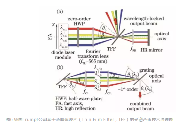 2014年至2015年間,德國Trumpf公司提出了一種基于薄膜濾波片(Thin Film Filter,TFF)實現波長選擇與合束的半導體激光外腔光譜合束技術。其技術路線原理圖如下圖所示。可以看出其結構較為復雜,但其10個標準厘米bar的合束譜寬僅37 nm。目前已經實現100 μm芯徑光纖半導體激光光譜合束輸出功率近500 W,并聲稱可實現5 kW的半導體激光合束輸出。