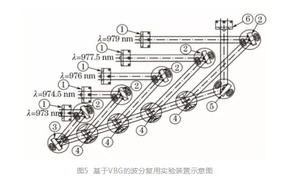 德國夫朗和費研究所于2013年提出了一種基于 VBG的高功率密集波分復用(HP-DWDM)結構。采用5個VBG波長鎖定的寬面發射半導體激光bar條進行合束,如下圖所示。當加載電流120 A時可得到合束功率大于200 W。光束質量M2因子約為45,復合束效率約85%。