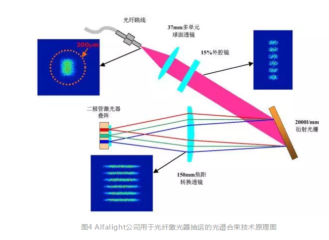 在光纖激光抽運方面,2012年Alfalight公司報道了針對光纖激光器抽運所研制的200 μm、0.2 NA尾纖輸出200 W的DL光譜合束裝置,并基于7個這種裝置進行抽運,成功實現了功率大于1 kW的摻鐿光纖激光輸出。其原理、結構如下圖所示。