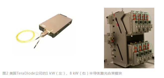目前這種技術方向的優勢單位是美國TeraDiode公司。它采用的則是麻省理工學院林肯實驗室的技術。目前已經可以實現50 μm、NA0.12光纖輸出功率大于2000 W與100 μm、NA0.2光纖輸出功率大于8000 W的產品研發,可應用于諸如金屬切割、焊接等工業加工應用中。如下圖所示。