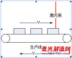 當被編碼產品在生產線上運動時,其相對振鏡掃描有一個反方向速度誤差V(如圖3所示)。該速度誤差V與生產線的速度相等。點陣式在線激光打碼技術通過在線監測生產線的速度來得到這個速度誤差,并能夠根據這個速度誤差產生一個補償信號來驅動振鏡,從而抵消這個誤差。