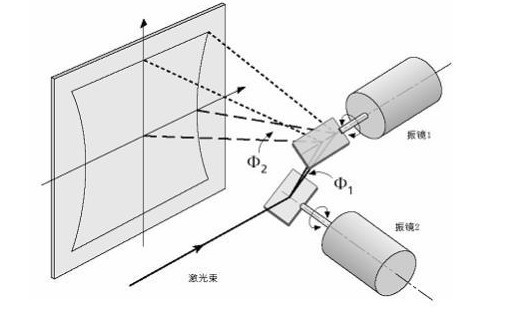 雙振鏡掃描是一種在光柵或矢量模式下對X-Y平面場進行掃描的簡單、低成本方式,如圖2-2。這種掃描方式的主要缺點是其在雙軸平面場掃描時存在固有的幾何失真。主要包括枕形失真、線性失真和在平面場上成像光束的焦點誤差。通過在雙振鏡掃描系統后增加一個F-θ透鏡,可以對焦點誤差進行校正,使得激光束能夠聚焦在同一焦平面上,并對掃描系統進行一定的失真校正。但其無法實現對X軸枕形失真的校正,并產生Y軸方向的桶形失真[6]。