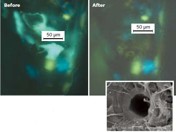 圖1:采用超快激光燒蝕技術可以釋放石英樣品中內含物中捕獲的石油(左圖為燒蝕前,右圖為燒蝕后)。掃描電子顯微圖像(下圖)顯示了激光在石英樣品上打的孔。